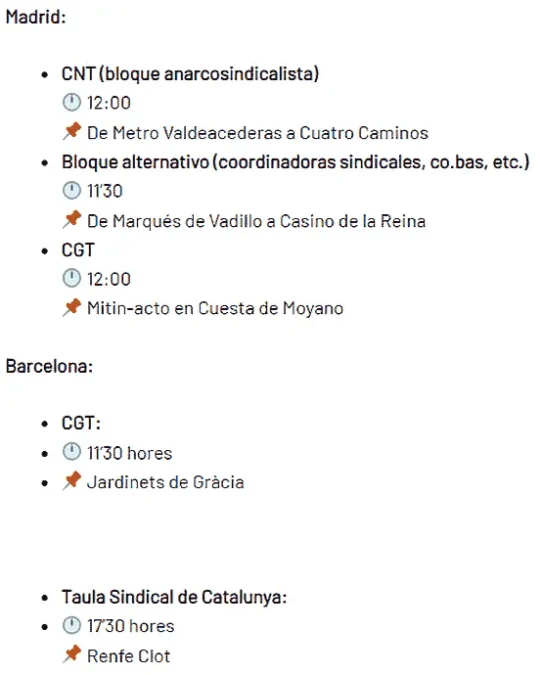 Ante esta realidad, distintas organizaciones del sindicalismo alternativo han convocado movilizaciones propias. La Confederación General del Trabajo (CGT), con presencia en numerosas ciudades, saldrá a la calle con un discurso claro contra la explotación y por la autogestión. La Confederación Nacional del Trabajo (CNT) volverá a reivindicar la acción directa y la organización horizontal. La Intersindical —en sus distintas expresiones territoriales— pondrá el acento en la defensa de los derechos laborales y sociales desde una perspectiva de soberanía popular. Solidaridad Obrera, la COS (Coordinadora Obrera Sindical), Cobas y otros sindicatos de base también han convocado también actos y manifestaciones unitarias que buscan recuperar el carácter combativo de la jornada.