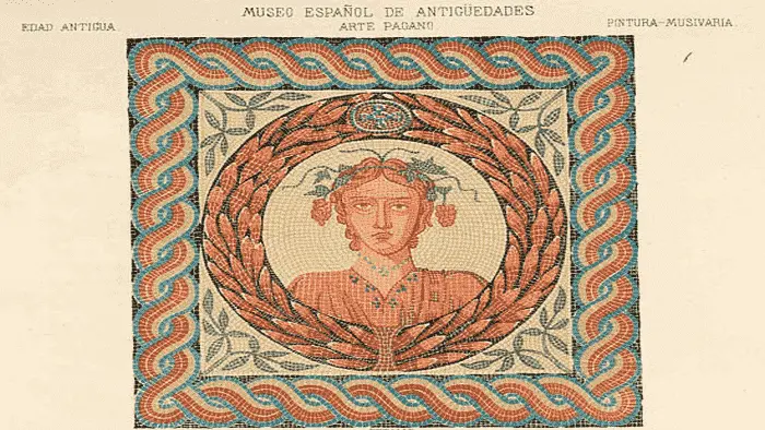 También ofrece una descripción detallada del mosaico, que representa: «el otoño bajo la figura de una mujer, cuyos negros y rizados cabellos coronan pámpanos y tallos de vid, cayendo a cada lado dos gruesos racimos de uvas. Viste túnica romana».