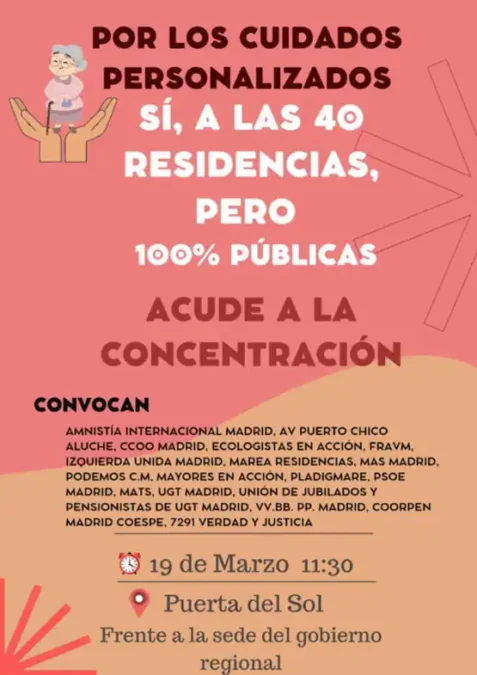 Ante este proyecto, las organizaciones Mayores en Acción, Marea de Residencias, PLADIGMARE, la Coordinadora de Pensionistas COESPE, 7291 Verdad y Justicia, Amnistía Internacional, CCOO, Ecologistas en Acción, AV Puerto Chico, la FRAVM, IU, Más Madrid, Podemos, PSOE, MATS, UGT, Unión de Jubilados y Pensionistas de UGT y VVBB PP Madrid se han unido para defender un modelo de residencias de gestión pública y con participación ciudadana. Y en este marco, tras una rueda de prensa que dieron la semana pasada, han convocado una concentración el 19 de marzo ante la sede del Gobierno regional.
