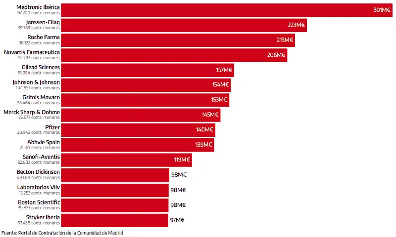 La empresa más beneficiada por estos contratos es Medtronics Ibérica, especializada en tecnología sanitaria, que se embolsó más de 300 millones entre 2016 y 2024. La farmacéutica Janssen es la segunda en la lista tras firmar casi 40.000 contratos menores que suman 223 millones. Roche se coloca en el tercer lugar con más de 38.000 contratos con la mínima fiscalización por valor de más de 212 millones.