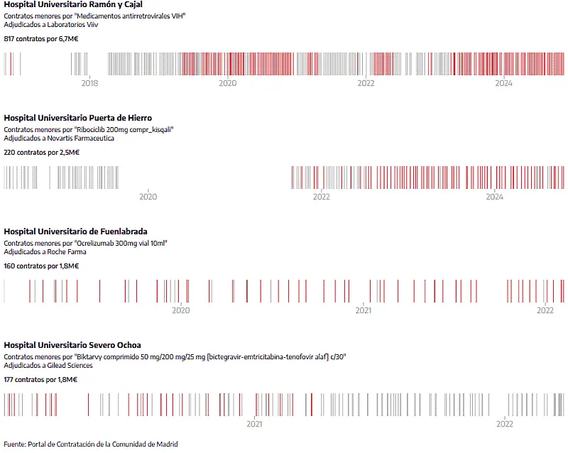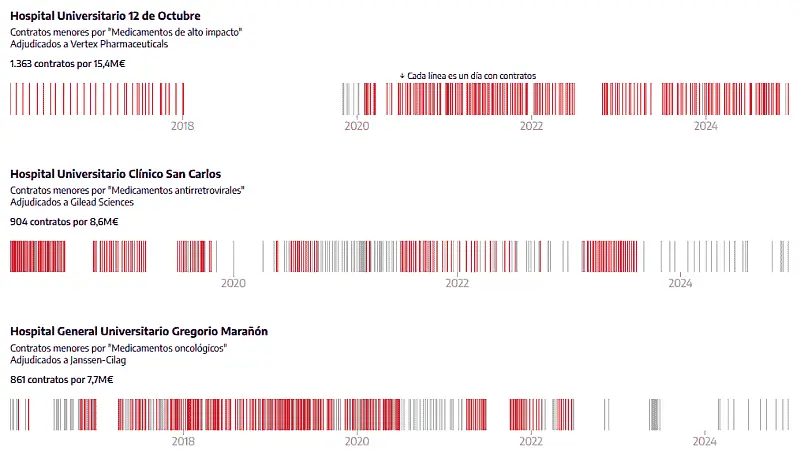 El análisis exhaustivo de más de cuatro millones de contratos menores suscritos entre 2016 y 2024, realizado por elDiario.es con los datos del Portal de Contratación Pública de la Comunidad de Madrid, revela anomalías como, por ejemplo, la firma de 40 acuerdos por “medicamentos de alto impacto” el 17 de marzo de 2022 en el Hospital 12 de Octubre de Madrid con la farmacéutica Vertex. Todos suman 434.000 euros, pero se adjudicaron de 15.000 en 15.000.