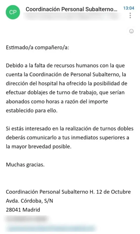 La Gerencia del Hospital 12 de Octubre y la Consejería de Sanidad han eliminado 32 contratos en la plantilla de Celadores de este hospital. Ahora ante la falta de plantilla la solución que dan a este problema es pedir a los/as trabajadores/as que doblen turnos