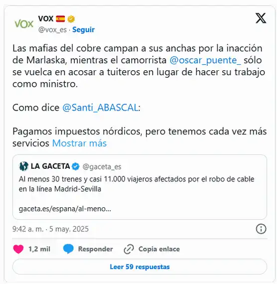 ¿España se va a negro? Culpa del Gobierno. ¿Hay un robo de cable en cinco puntos de la línea de alta velocidad Madrid-Sevilla? Culpa del Gobierno. ¿Piove? ¡Porco Governo! La oposición no tiene duda: ¡Tenemos servicios del tercer mundo!, claman los de Vox. “Las mafias del cobre campan a sus anchas por la inacción de Marlaska mientras el camorrista Puente solo se vuelca en acosar a tuiteros en lugar de hacer su trabajo como ministro”, se lee en la red social X de los ultras.
